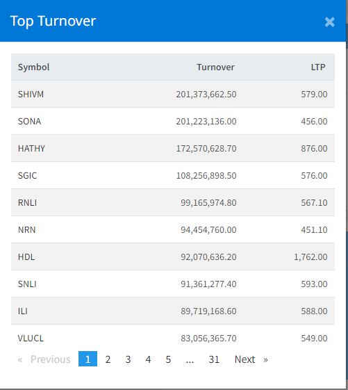 सेयर बजारमा गिरवट आउँदा साेमबार शिवम् सिमेन्टको सर्वाधिक कारोबार भएको छ । कम्पनीको यस दिन २० करोड १३ लाख ७३ हजार रुपैयाँ बराबरको कारोबार भएको छ । त्यस्तै, सोनापुर मिनरल्सको २० करोड १२ लाख २३ हजार हजार रुपैयाँ, हाथवे इन्भेष्टमेन्टको १७ करोड २५ लाख ७० हजार रुपैयाँ, सानिमा जिआइसी इन्स्योरेन्सको १० करोड ८२ लाख ५६ हजार रुपैयाँ र रिलायबल नेपाल लाइफ इन्स्योरेन्सको ९ करोड ९१ लाख ६५ हजार रुपैयाँको कारोबार भएको हो ।