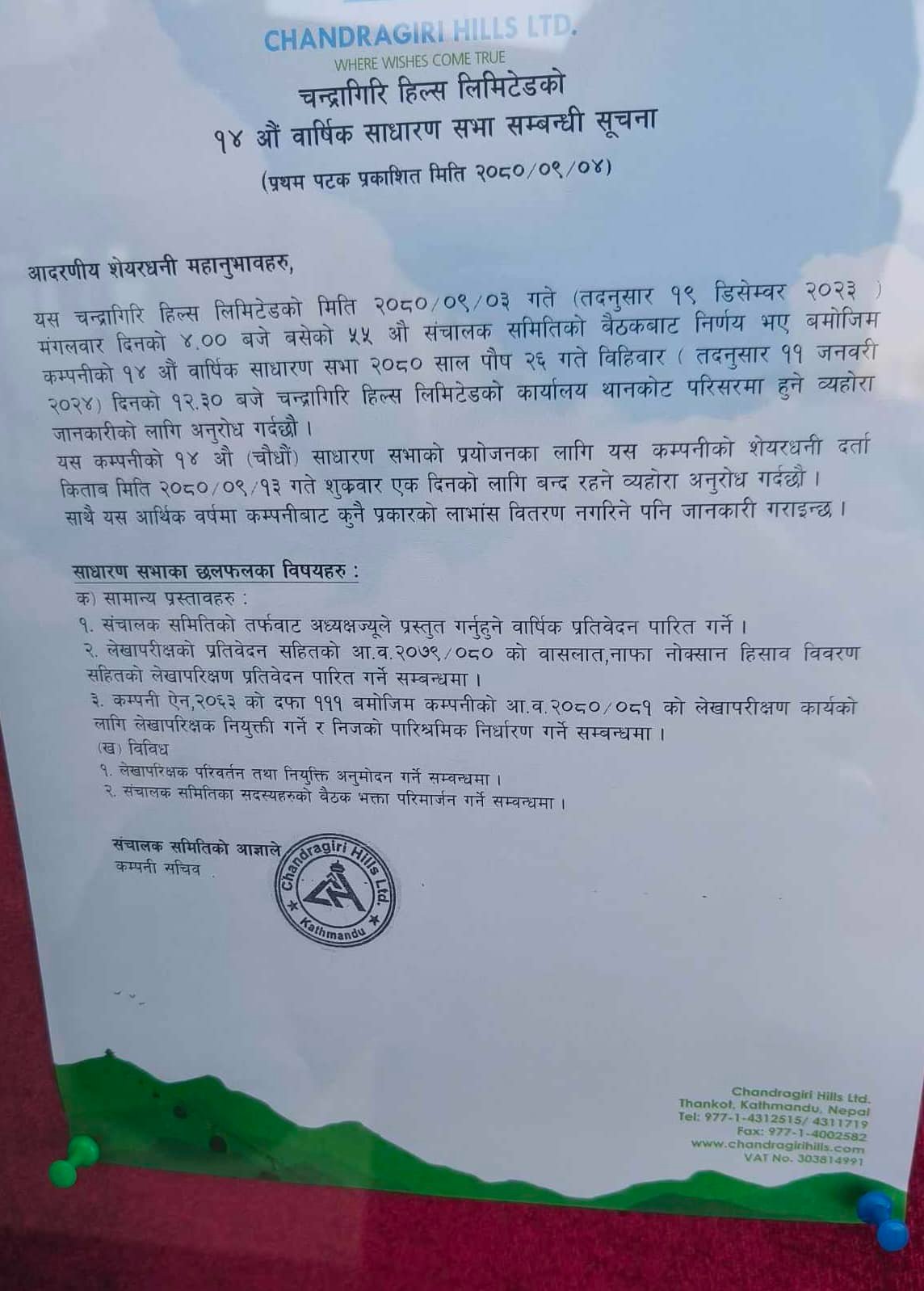 चन्द्रागिरि हिल्सले साधारण सभा बिहीबार, सेयरधनीको हात खाली