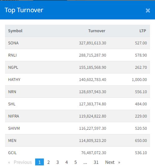 आज सबैभन्दा बढी सोनापुर मिनरल्सको कारोबार भएको छ । कम्पनीको ३२ करोड ७८ लाख ९१ हजार रुपैयाँ बराबरको कारोबार भएको छ । त्यस्तै, रिलायबल नेपाल लाइफ इन्स्योरेन्सको २८ करोड ८७ लाख १५ हजार हजार रुपैयाँ, ङादी ग्रुप पावरको १५ करोड ५१ लाख ८५ हजार रुपैयाँ, हाथवे इन्भेष्टमेन्टको १४ करोड ६ लाख २ हजार रुपैयाँ र एनआरएन इन्फ्रास्ट्रक्चर डेभलपमेन्टको १२ करोड ८६ लाख ९७ हजार रुपैयाँको कारोबार भएको हो ।