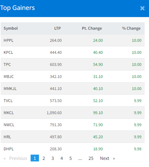 आज हिमालयन पावर पार्टनर, कालिका पावर कम्पनी, तेह्रथु पावर कम्पनी, मध्य भोटेकाशी जलविद्युत, माथिल्लो मैलुन खोला जलविद्युत, त्रिशुली जलविद्युत, मुक्तीनाथ कृषि कम्पनी, नेपाल वयरहाउजिङ, हिमालयर रि, दिव्यश्वरी हाइड्रोपावर र रसुवागढी हाइड्रोपावरको सेयरमूल्य सर्वाधिक बढेको छ ।