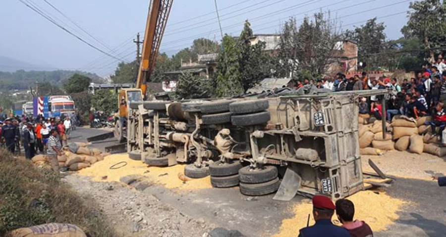 ट्रक सडकमै पल्टिँदा माेटरसाइकल र अटोमा सवार दुईजनाको च्यापिएर मृत्यु