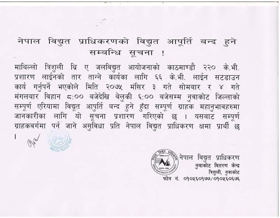 नुवाकोटमा दुई दिन विद्युत् आपूर्ति बन्द हुने