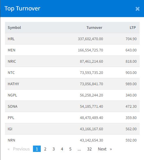 मंगलबार सबैभन्दा बढी हिमालयन रि इन्स्योरेन्स लिमिटेडको सेयर कारोबार भएको छ । कम्पनीको यस दिन ३३ करोड ७६ लाख २ हजार रुपैयाँ बराबरको कारोबार भएको छ । त्यस्तै, माउन्टेन इनर्जीको १६ करोड ६५ लाख ५४ हजार रुपैयाँ, नेपाल रि इन्स्योरेन्स कम्पनीको ८ करोड ७४ लाख ६१ हजार रुपैयाँ, नेपाल दुरसंचार कम्पनीको ७ करोड ३५ लाख ९३ हजार रुपैयाँ र हाथवे इन्भेष्टमेन्टको ७ करोड ३० लाख ५६ हजार रुपैयाँको कारोबार भएको हो ।