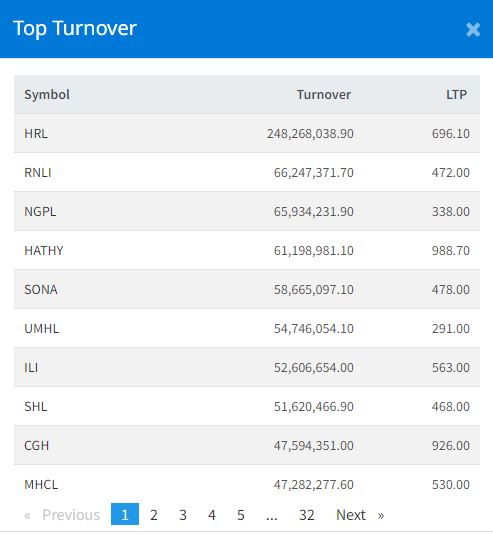 बुभबार सबैभन्दा बढी हिमालयन रि इन्स्योरेन्स लिमिटेडको सेयर कारोबार भएको छ । कम्पनीको यस दिन २४ करोड ८२ लाख ६८ हजार रुपैयाँ बराबरको कारोबार भएको छ । त्यस्तै, रिलायबल नेपाल लाइफ इन्स्योरेन्सको ६ करोड ६२ लाख ४७ हजार रुपैयाँ, ङादी ग्रुप पावरको ६ करोड ५९ लाख ३४ हजार रुपैयाँ, हाथवे इन्भेष्टमेन्टको ६ करोड ११ लाख ९८ हजार रुपैयाँ र सोनापुर मिनरल्सको ५ करोड ८६ लाख ६५ हजार रुपैयाँको कारोबार भएको हो ।