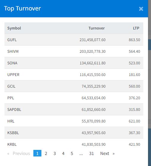 साेमबार गाेर्खाज फाइनान्सको सर्वाधिक सेयर कारोबार भएको छ । आज कम्पनीको २३ करोड १४ लाख ५८ हजार रुपैयाँ बराबरको कारोबार भएको छ । शिवम् सिमेन्टको २० करोड ३० लाख २० हजार रुपैयाँ, सोनापुर मिनरल्सको १३ करोड ४६ लाख ६२ हजार रुपैयाँ, अपर तामाकोशी हाइड्रोपावरको ११ करोड ६४ लाख १५ हजार रुपैयाँ र घोराही सिमेन्ट इन्डस्ट्रीको ७ करोड ४३ लाख ५५ हजार रुपैयाँको कारोबार भएको हो ।