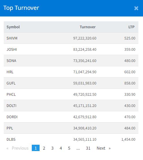 बुधबार शिवम् सिमेन्टको सेयर सर्वाधिक सेयर कारोबार भएको छ । आज कम्पनीको ९ करोड ७२ लाख २२ हजार रुपैयाँ बराबरको कारोबार भएको छ । त्यस्तै, जोशी हाइड्रोपावरको ८ करोड ३२ लाख २४ हजार रुपैयाँ, सोनापुर मिनरल्सको ७ करोड ३३ लाख ५६ हजार रुपैयाँ, हिमालयन रि इन्स्योरेन्सको ७ करोड १० लाख ४७ हजार रुपैयाँ र गाेर्खाज फाइनान्सको ५ करोड ९० लाख ३१ हजार रुपैयाँको कारोबार भएको छ ।