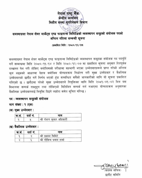 २८ चैत, काठमाडाैं । समस्याग्रस्त नेपाल शेयर मार्केट एण्ड फाइनान्सको व्यवस्थापन समूहको संयोजक पदमा रोशन कुमार अधिकारी मुख्य उम्मेदवारका रुपमा छनौट भएका छन् ।