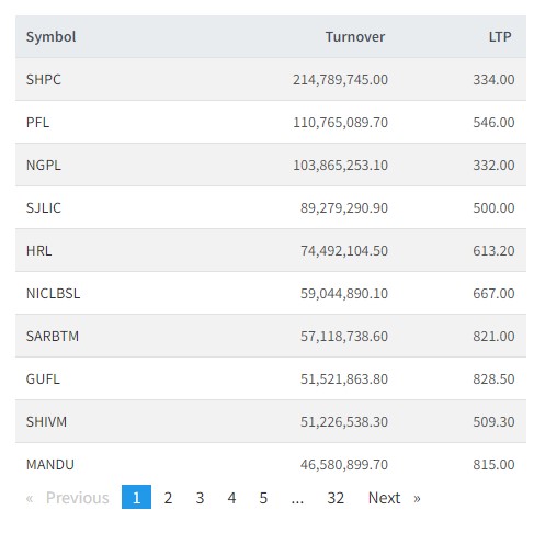 आज सानिमा माईको सर्वाधिक कारोबार भएको छ। त्यस्तै, पोखरा फाइनान्स, नाग्दी गुप्र पावर, हिमालयन रि, एनआईसी एशिया लघुवित्त, सर्वोत्त्तम सिमेन्टस, गाेर्खाज फाइनानस, शिवम सिमेन्टस, माण्डु हाईड्रोपावरको सर्वाधिक कारोबार भएको छ ।