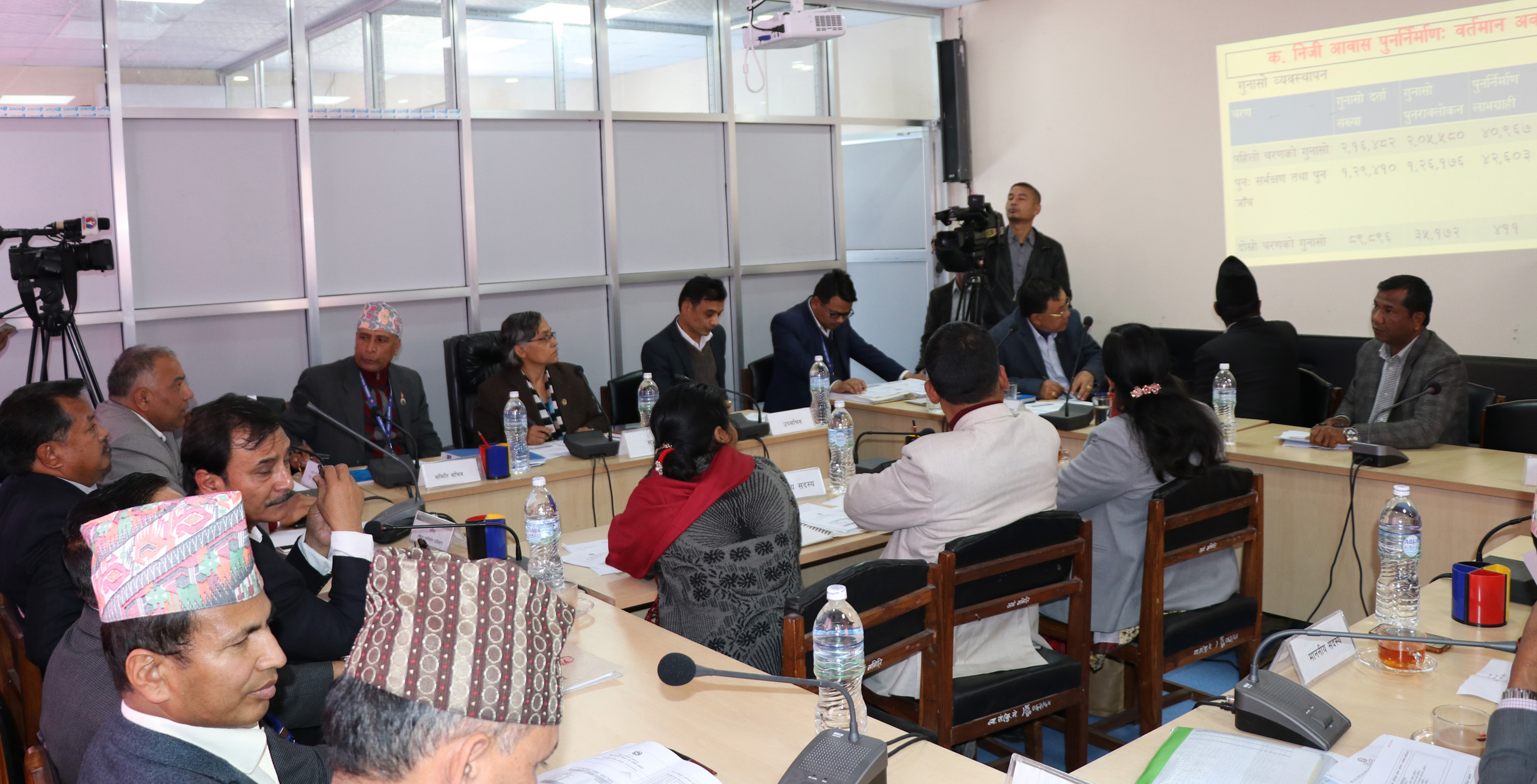 समितिको बैठकमा राष्ट्रिय पुनर्निर्माण प्राधिकरणका प्रमुख कार्यकारी अधिकृत सुशील ज्ञवालीले पछिल्लो समय पुनर्निर्माणको कामले गति लिएकाले यसै आर्थिक वर्षभित्रै निजी आवास पुनर्निर्माणको काम सक्ने दावी गर्नुभयो ।