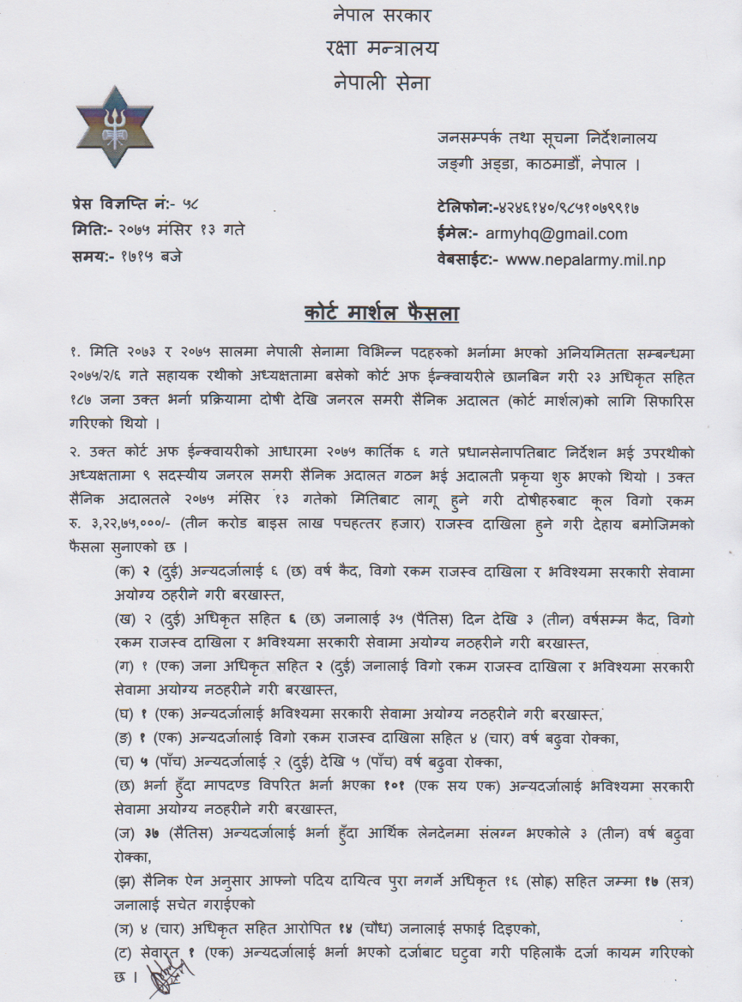 १३ मंसिर, काठमाडाैँ । नेपाली सेनाले २०७३ र २०७५ सालमा विभिन्न पदहरुको भर्नामा अनियमितता गरेको आरोपमा १९ अधिकृतसहित १७३ सैनिक कारबाही गरेको छ । गत जेठ २ गते बसेको नेपाली सेनाको कोर्ट अफ इन्क्वायरीले छानबिन गरी २३ अधिकृतसहित १८७ जनालाई भर्ना प्रक्रियामा दोषी ठहर गर्दै समरी सैनिक अदालतसमक्षय सिफारिस गरेको थियो ।