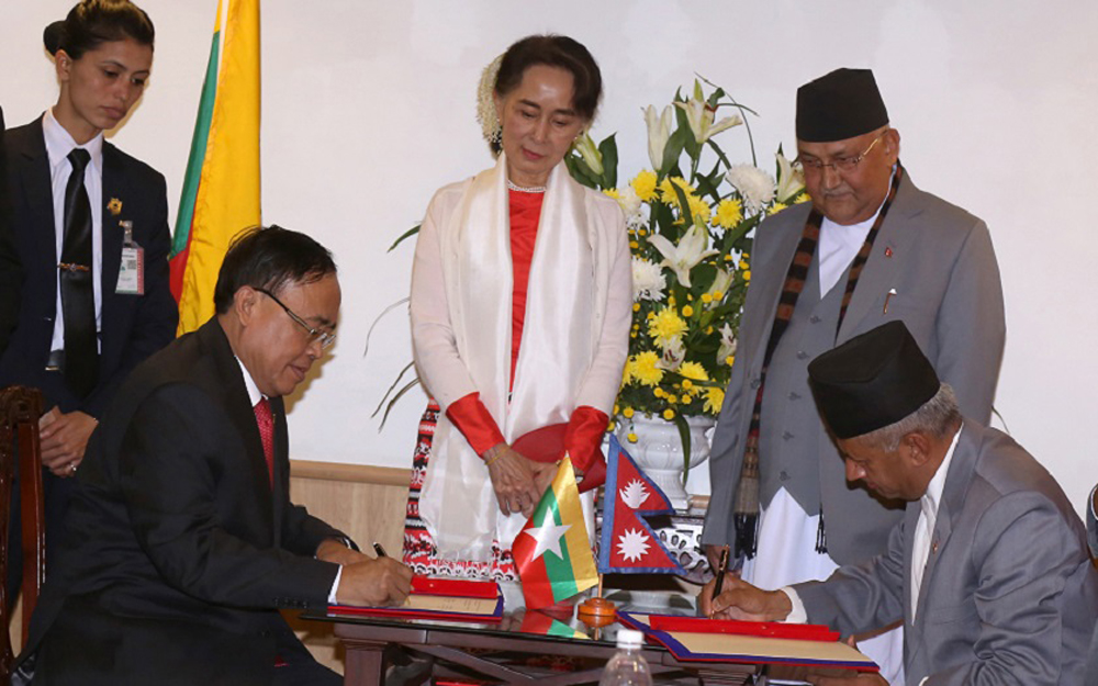 १४ मंसिर, काठमाडौँ । नेपाल र मित्र राष्ट्र म्यान्माबीच पहिलोपटक आज व्यापार र लगानीसम्बन्धी सम्झौता भएको छ । प्रधानमन्त्री केपी शर्मा ओली र नेपालको औपचारिक भ्रमणमा रहेकी म्यान्माका स्टेट काउन्सिलर आङ सान सु कीबीच भएको अलग अलग भेट र द्विपक्षीय वार्तापछि उनीहरुको उपस्थितिमा सो सम्झौतामा हस्ताक्षर भएको हो । सम्झौतामा नेपालका तर्फबाट परराष्ट्रमन्त्री प्रदीपकुमार ज्ञवाली र म्यान्माका तर्फबाट अन्तर्राष्ट्रिय व्यापार सहकार्यमन्त्री यु क्यो टिनले हस्ताक्षर गरेका थिए ।