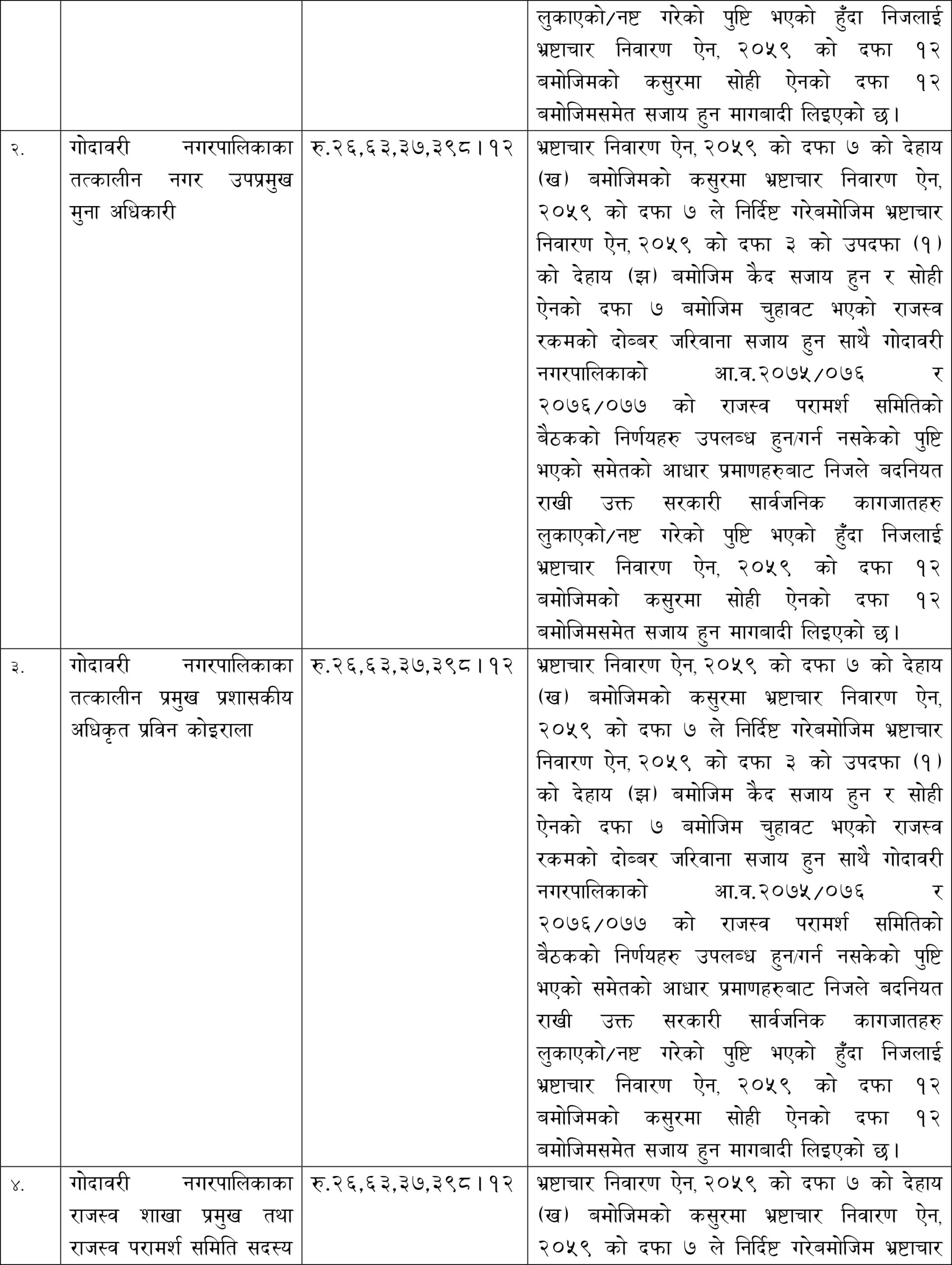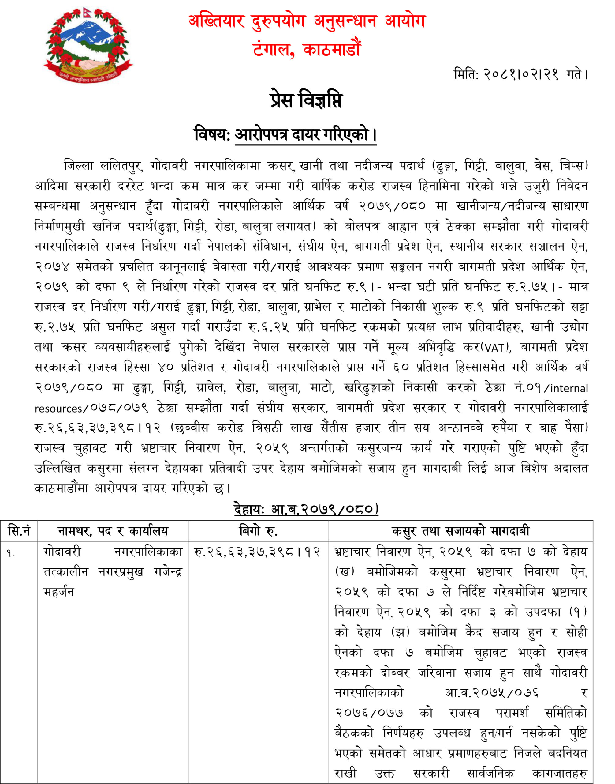 २२ जेठ, काठमाडौँ । अख्तियार दुरुपयोग अनुसन्धान आयोगले नेपाली कांग्रेसका नेताद्धय ललितपुरको गोदावरी नगरपालिकाका नगरप्रमुख गजेन्द्र महर्जन र उपप्रमुख मुना अधिकारीसहित नौजनाविरुद्ध विशेष अदालतमा भ्रष्टाचार मुद्दा दायर गरेको छ । राजस्व चुहावट गरी भ्रष्टाचार गरेको अभियोगमा एक अर्ब ५९ करोड ८० लाख २४ हजार तीन सय ८८ रूपैयाँको बिगो मागदाबी गर्दै अख्तियारले उनीहरूविरूद्ध भ्रष्टाचार मुद्दा दर्ता गरेको हो ।