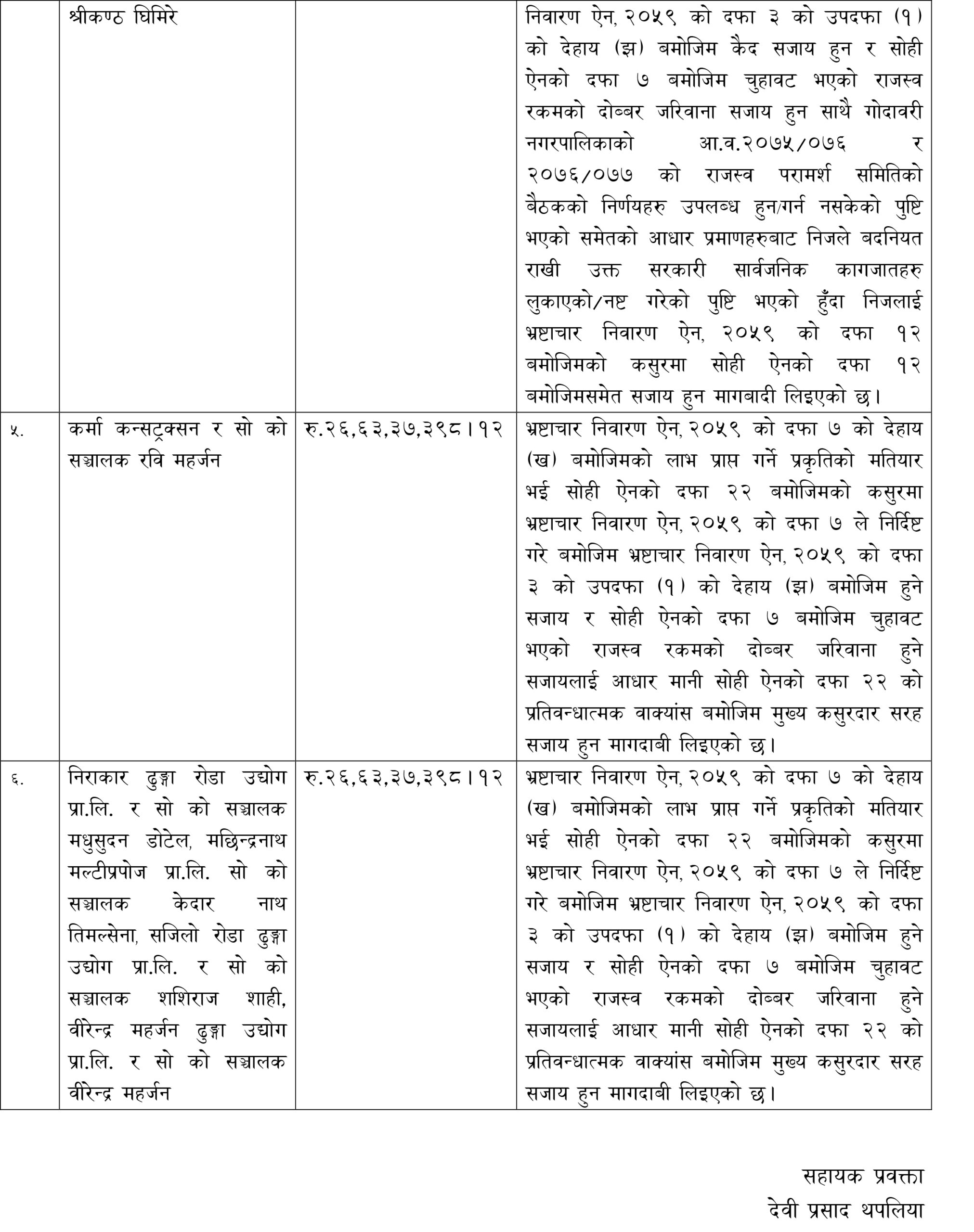 नगरपालिकाका तत्कालीन प्रमुख प्रशासकीय अधिृकत प्रविन कोइराला, राजस्व शाखा प्रमुख श्रीकण्ठ घिमिरे, कर्मा कन्स्ट्रक्सन र त्यसका सञ्चालक रवि महर्जन, निराकार ढुङ्गा रोडा उद्योगका सञ्चालक मधुसुदन डोटेल, मछिन्द्रनाथ मल्टीप्रपोजका सञ्चालक केदारनाथ तिमल्सेना, सजिलो रोडा उद्योगका सञ्चालक शशिराज शाही र वीरेन्द्र महर्जन विरुद्ध पनि समान बिगो दावी गरिएको आयोगका सहायक प्रवक्ता देवीप्रसाद थपलियाले जानकारी दिएका छन । मुद्दाको विस्तृत विवरण तल हेर्न सक्नुहुन्छ ।