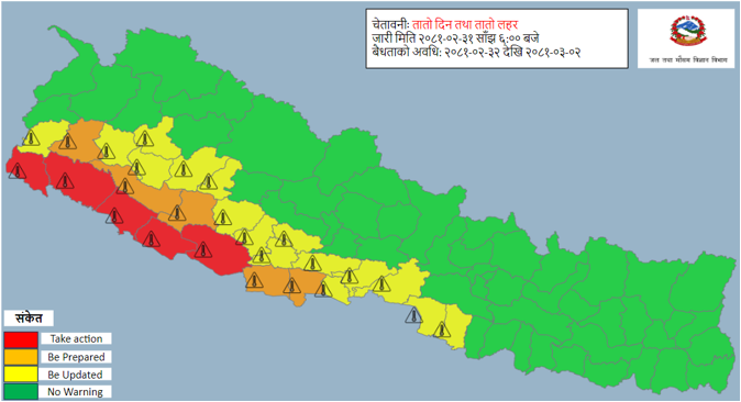 विभागले बिहीबार साँझ विशेष बुलेटिन निकालेर कञ्चनपुर, कैलाली, बर्दिया, बाँके र दाङमा तातो हावा र तातो लहरको सम्भावना रहेको जनाउँदै ती स्थानका बासिन्दालाई सचेत रहन आग्रह गरेको हो ।