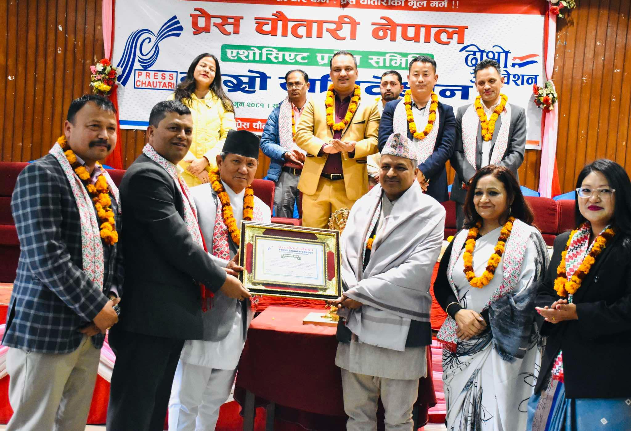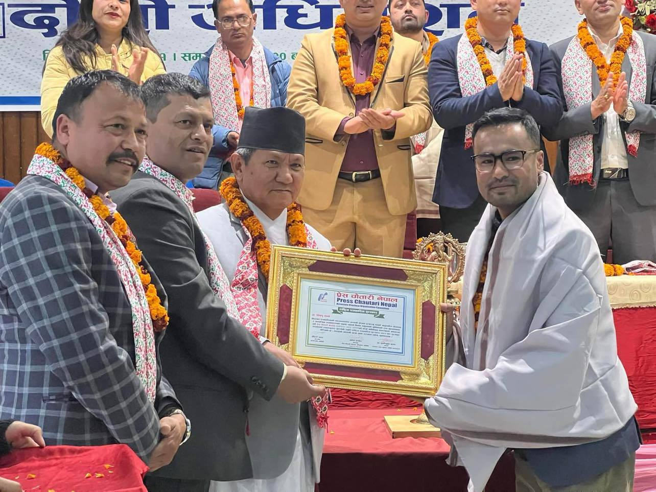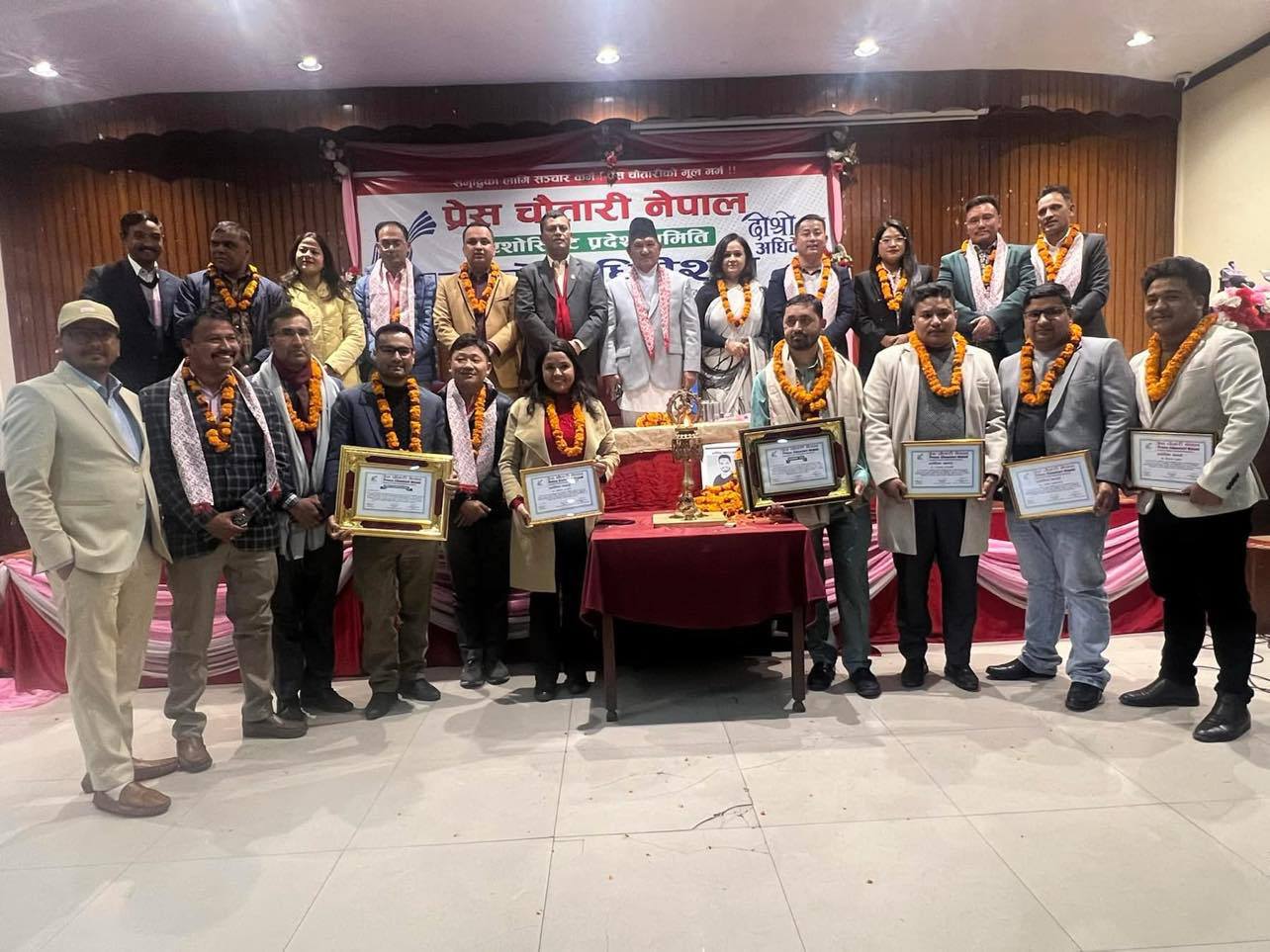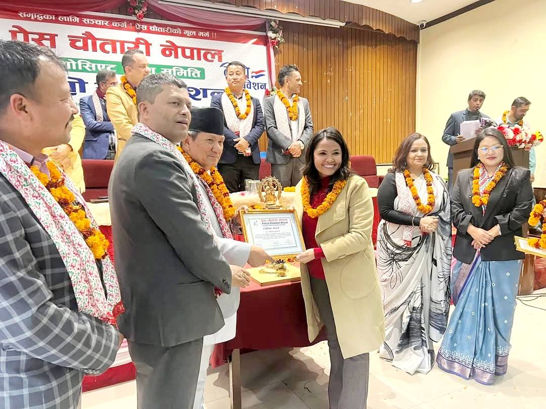 अधिवेशनमा नेपाल पत्रकार महासंघमा केन्द्रीय सदस्यमा विजयी हुनुभएको पवित्रा मुडभरीसहित प्रदेश कमिटीमा निर्वाचित प्रेस चौतारीका सदस्यहरूलाई सम्मानित गरिएको थियो ।