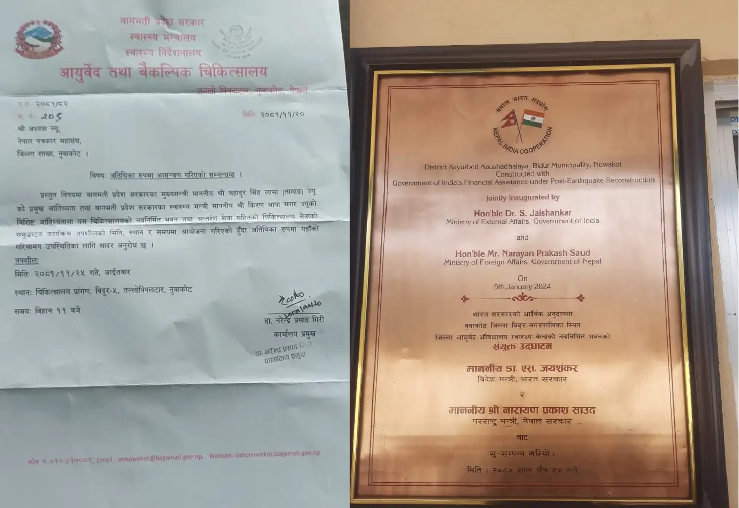 २६ फागुन, नुवाकोट । बागमती प्रदेशका मुख्यमन्त्री बहादुरसिंह लामालाई रिबन काट्ने रहर चढेपछि तत्कालीन परराष्ट्रमन्त्री एनपि साउद र भारतीय विदेशमन्त्री एस जयशंकरले संयुक्त रूपमा उद्घाटन गरेको नुवाकोटको विदुर नगरपालिका–५ पिपलटारस्थित आयुर्वेद तथा वैकल्पिक चिकित्सालयको पुनः उद्घाटन भएको छ । यसअघि भारत सरकारको सहयोगमा निर्माण भएका तीन दर्जन भवनको एकै पटक उद्घाटन गरिएको थियो ।