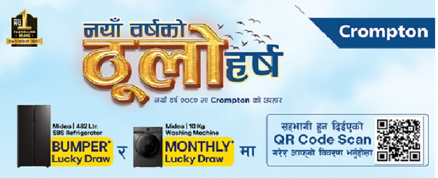 २४ चैत, काठमाडौं । नयाँ वर्ष २०८२ को अवसरलाई ध्यानमा राख्दै सीजी इलेक्ट्रोनिक्सले ग्राहकहरूको लागि रोमाञ्चक योजना घोषणा गरेको छ । ‘नयाँ वर्षको ठूलो हर्ष’ योजना अन्तर्गत, क्रोम्प्टन उत्पादनहरू खरिद गर्ने ग्राहकहरूले क्यूआर कोड स्क्यान गरी आकर्षक उपहार जित्ने मौका पाउनेछन् ।
