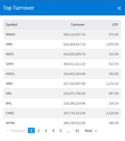 यस दिन सबैभन्दा बढी राधी विद्युत कम्पनीको सेयर कारोबार भएको छ । आज कम्पनीको ५८ करोड ४२ लाख १४ हजार रुपैयाँ बराबरको कारोबार भएको छ । त्यस्तै, एनआरएन एन्फ्रास्ट्रक्चरको ५१ करोड ६३ लाख ६९ हजार रुपैयाँ, ङादी ग्रुप पावरको ४१ करोड ९ लाख ३५ हजार रुपैयाँ, सानिमा माई हाइड्रोपावरको ३५ करोड ८९ लाख ११ हजार रुपैयाँ र  एचआइडिसिएलको ३१ करोड ६४ लाख ६२ हजार रुपैयाँको कारोबार भएको हो ।