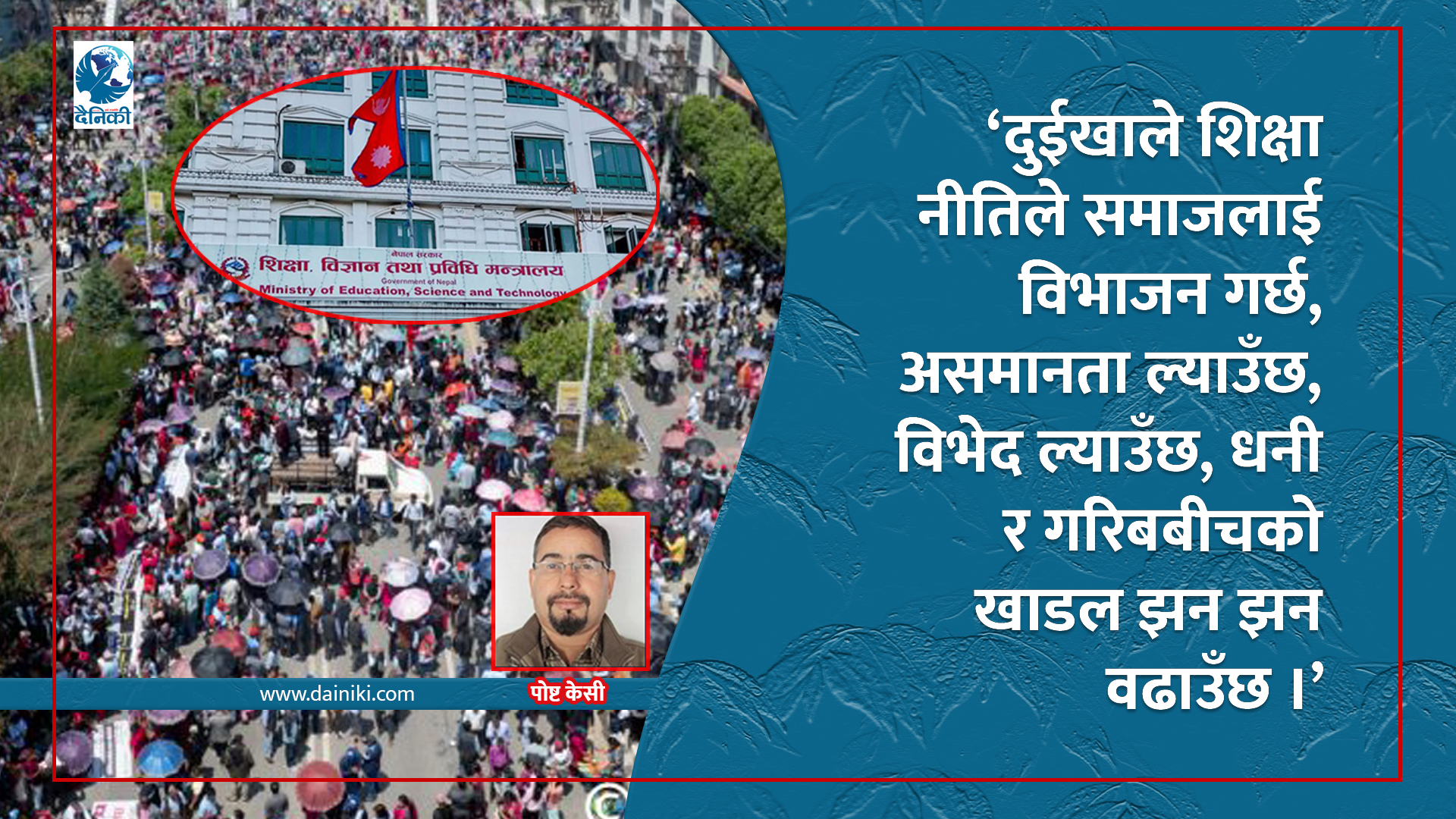 अन्तमाः शिक्षा क्षेत्रको विकासमा सरकार र राजनीतिक दल किन उदासिन देखिएका छन, यसको वारेमा गम्भिर विश्लेषण गर्नुपर्ने देखिन्छ । नेपालमा सबै नीजि विद्यालयलाई निश्चित मापदन्ड बनाएर सरकारीकरण गर्नुपर्छ । शिक्षामा भएको व्यापारीकरण वन्द गर्नुपर्छ । शिक्षा महंगो भयो भने सबैका लागि शिक्षा नहुन सक्छ । गरिवका छोरा छोरीले पढने अवसरवाट वञ्चित हुन सक्छन । त्यसैले दुईखाले शिक्षा नीतिको अन्त हुनु पर्छ । दुईखाले शिक्षा नीतिले समाजलाई विभाजन गर्छ, असमानता ल्याउछ, विभेद ल्याउछ, धनी र गरिवबीचको खाडल झन झन वढाउछ । शिक्षा क्षेत्रलाई राजनीति दलको भर्ति केन्द्र वनाउने होईन शिक्षा सेवा आयोग मार्फत शिक्षक नियुक्ति तथा परिचालन गरिनु पर्छ । भनसुन,पहुच, प्रभाव, दवावका आधारमा शिक्षकको रुपमा प्रवेश वन्द गर्नुपर्छ । अवको शिक्षा विद्येयकमा माथी यी सवै समेटिएर गरिव जनताको विद्येयक आउने अपेक्षा गरिएको छ ।