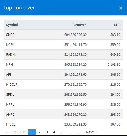 यस दिन सबैभन्दा बढी सानिमा माइ हाइड्रोपावरका सेयर कारोबार भएको छ । आज कम्पनीको ६० करोड ४८ लाख ६६ हजार रुपैयाँ बराबरको कारोबार भएको छ । त्यस्तै, ङादी ग्रुप पावरको ५५ करोड १४ लाख ६४ हजार रुपैयाँ, राधी विद्युत कम्पनीको ५१ करोड ४६ लाख ८ हजार रुपैयाँ, एनआरएन इन्फ्रास्ट्रक्चरको ५० करोड ५६ लाख ९३ हजार रुपैयाँ, अपी पावर कम्पनीको ३९ करोड ४५ लाख ५१ हजार रुपैयाँ बराबरको कारोबार भएको हो ।
