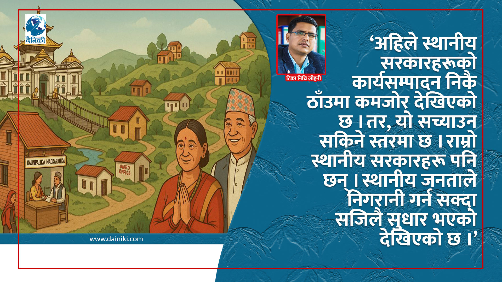 घरघरमा सिंहदरवार हाम्रो आवश्यकता हो । सरल आवश्यकता । खर्च थप नचाहिने आवश्यकता । थप बजेट नचाहिने आवश्यकता । स्रोतका लागि हारगुहार नगर्नु पर्ने आवश्यकता । हावा सपना हैन्, सम्भव आवश्यकता । अर्थशास्त्रको भाषामा चाहाना (want) हैन, आवश्यकता (need) । स्थानीय सरकार जनताको घरदैलोको सरकार ।