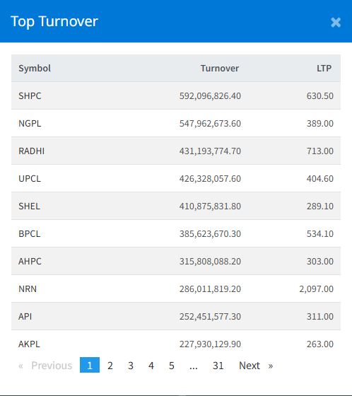 आज सबैभन्दा बढी सानिमा माइ हाइड्रोपावरको सेयर कारोबार भएको छ । आज कम्पनीको ५९ करोड २० लाख ९६ हजार रुपैयाँ बराबरको कारोबार भएको छ । त्यस्तै, ङादी ग्रुप पावरको ५४ करोड ७९ लाख ६२ हजार रुपैयाँ, राधी विद्युत कम्पनीको ४३ करोड ११ लाख ९३ हजार रुपैयाँ, युनिभर्सल पावर कम्पनीको ४२ करोड ६३ लाख २८ हजार रुपैयाँ, सिंगटी हाइड्रो इनर्जीको ४१ करोड ८ लाख ७५ हजार रुपैयाँको कारोबार भएको हो ।