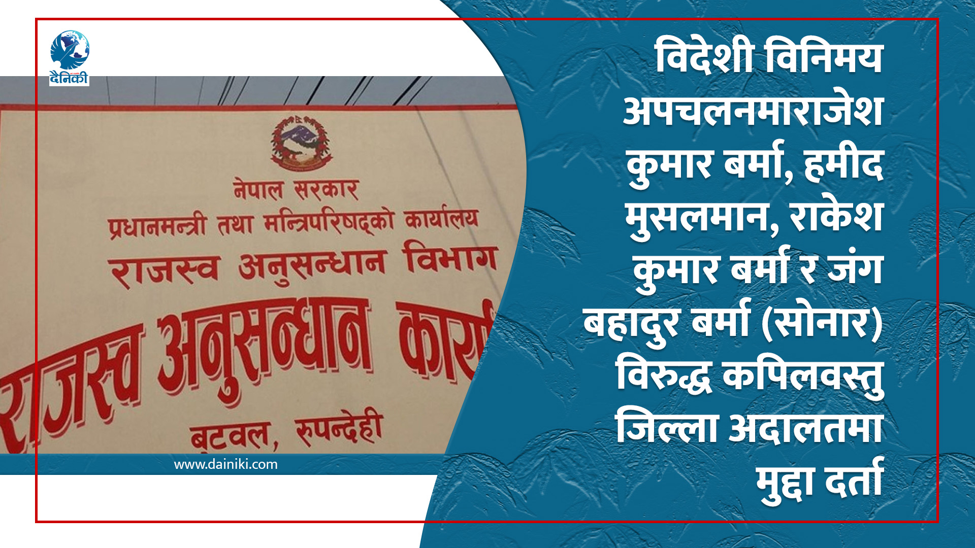 उक्त कार्य विदेशी विनिमय (नियमित गर्ने) ऐन, २०१९ (संशोधन सहित) को दफा ३, ४ र ५ तथा सोही ऐनको दफा १२ को अधिकार प्रयोग गरी नेपाल राष्ट्र बैंक, केन्द्रीय कार्यालय, विदेशी विनिमय व्यवस्थापन विभागले मिति २०७८/०९/२३ मा जारी गरेको एकीकृत परिपत्र –२०७८ को दफा (७) मा भएको व्यवस्थाले निषेध गरेको कार्य गरेको देखिन आएकोले प्रतिवादीहरुको साथबाट बरामद भएको भारु २१,३८,०००को नेपाल राष्ट्र बैङ्कले तोकेको विनिमय दर प्रति भारु १.६०१५ ने.रु. का दरले हिसाब गर्दा हुने ने. रु. ३४,२४,००७ जम्मा बिगो कायम गरी प्रतिवादीहरु जिल्ला कपिलवस्तु, शुद्धोधन गा.पा., वडा नं.–६, बिमिहा बस्ने बर्ष ३५ का राजेश कुमार बर्मा, जिल्ला कपिलवस्तु, शुद्धोधन गा.पा., वडा नं.–६, बिमिहा बस्ने बर्ष २६ का राकेश कुमार बर्मा, जिल्ला कपिलवस्तु, मायादेवी गा.पा., वडा नं.–१, ईमिलिया बस्ने बर्ष २८ का हमीद मुसलमान, जिल्ला कपिलवस्तु, शुद्धोधन गा.पा., वडा नं.–६, बिमिहा बस्ने बर्ष ५६ का जंग बहादुर बर्मा (सोनार) लाई विदेशी विनिमय (नियमित गर्ने) ऐन, २०१९ (संशोधन सहित) को दफा १७(१) बमोजिम हदैसम्मको जरीवाना गरी पाउन र बरामद भएको प्रतिबन्धित भारतीय रुपैया २१,३८,००० जफत गरी पाउन साथै विदेशी मुद्रा सहित नियन्त्रणमा लिइएको ग्ए५५ब्ः०४५९ नम्बरको भारतीय गाडी विदेशी विनिमय अपचलनको कसूरमा प्रयोग भएको हुँदा उक्त सवारी साधनलाई कसूरजन्य सम्पत्ति तथा साधन (रोक्का, नियन्त्रण र जफत) ऐन, २०७० को दफा ११ बमोजिम समेत जफतको मागदाबी लिई प्रतिवादीहरु राजेश कुमार बर्मा, राकेश कुमार वर्मा, हमीद मुसलमान र जंग बहादुर बर्मा र सक्कल मिसिल साथ विदेशी विनिमय (नियमित गर्ने) ऐन, २०१९(संशोधन सहित) दफा १८ क(१) बमोजिम वैशाख २५ गते मुद्दा दायर गरिएको जारी विज्ञप्तिमा उल्लेख गरिएको छ ।