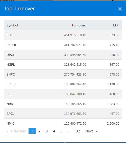 आज सबैभन्दा बढी सोल्टी होटलको सेयर कारोबार भएको छ । आज कम्पनीको ४६ करोड १९ लाख १५ हजार रुपैयाँ बराबरको कारोबार भएको छ । त्यस्तै, राधी विद्युत कम्पनीको ४४ करोड १७ लाख २ हजार रुपैयाँ, युनिभर्सल पावर कम्पनीको ३३ करोड ४५ लाख ९८ हजार रुपैयाँ, ङादी ग्रुप पावरको ३२ करोड ३६ लाख ४२ हजार रुपैयाँ, सानिमा माई हाइड्रोपावरको २७ करोड ७ लाख ५४ हजार रुपैयाँको कारोबार भएको हो ।