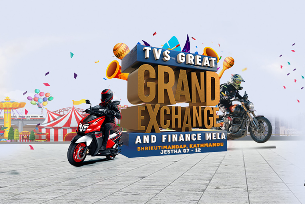 ६ जेठ, काठमाडौं । नेपालमा टिभीएसको एक मात्र आधिकारिक वितरक जगदम्बा मोटर्सले ‘टिभीएस ग्रेट ग्राण्ड एक्सचेन्ज एण्ड फाइनान्स मेला’ आयोजना गर्न लागेको छ । यही जेठ ७ देखि १२ गतेसम्म काठमाडौँको प्रसिद्ध स्थल ‘भृकुटीमण्डप’ मा आयोजना हुनेछ । यो विशेष अवसरमा ग्राहकहरूले आफ्नो पुरानो मोटरसाइकल वा स्कुटर साटेर नयाँ टिभीएस सवारी घर लैजान सक्नेछन् ।
