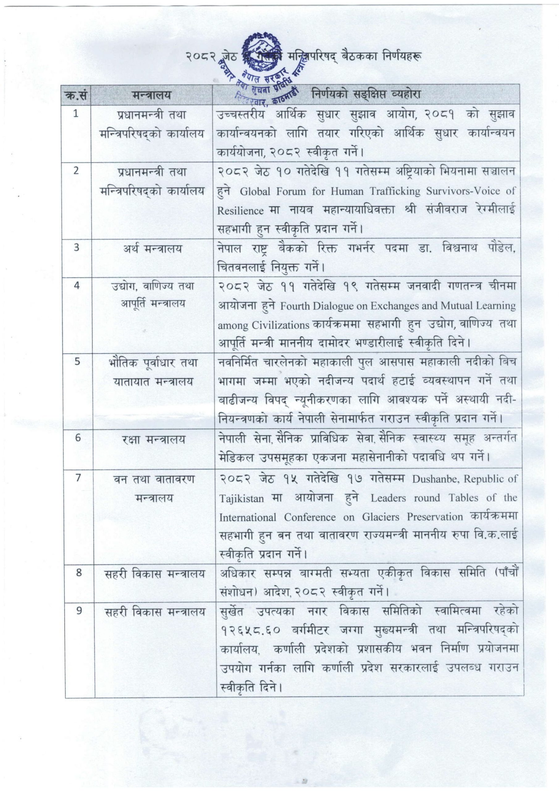 यस्ता छन् मन्त्रिपरिषद् बैठकका निर्णयहरू