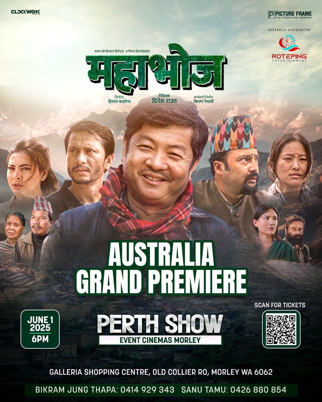 १६ जेठ, काठमाडौं । नेपालमा तय भएको प्रदर्शन अन्तिम समयमा स्थगित भएपछि चलचित्र ‘महाभोज’ अब अस्ट्रेलियामा पहिलो प्रिमियर हुने भएको छ । चलचित्रको भव्य प्रिमियर आगामी जुन १ तारिख, शनिवार, अस्ट्रेलियाको पर्थस्थित ग्यालेरिया सपिङ सेन्टरको इभेन्ट सिनेमामा आयोजना हुने पक्का भएको छ । साँझ ६ बजेबाट सुरु हुने प्रिमियरको व्यवस्थापन पर्थमा त्यहाका आयोजक र अस्ट्रेलिया वितरक रोटेपिङ इन्टरटेन्मेन्टले गरिरहेको छ ।
