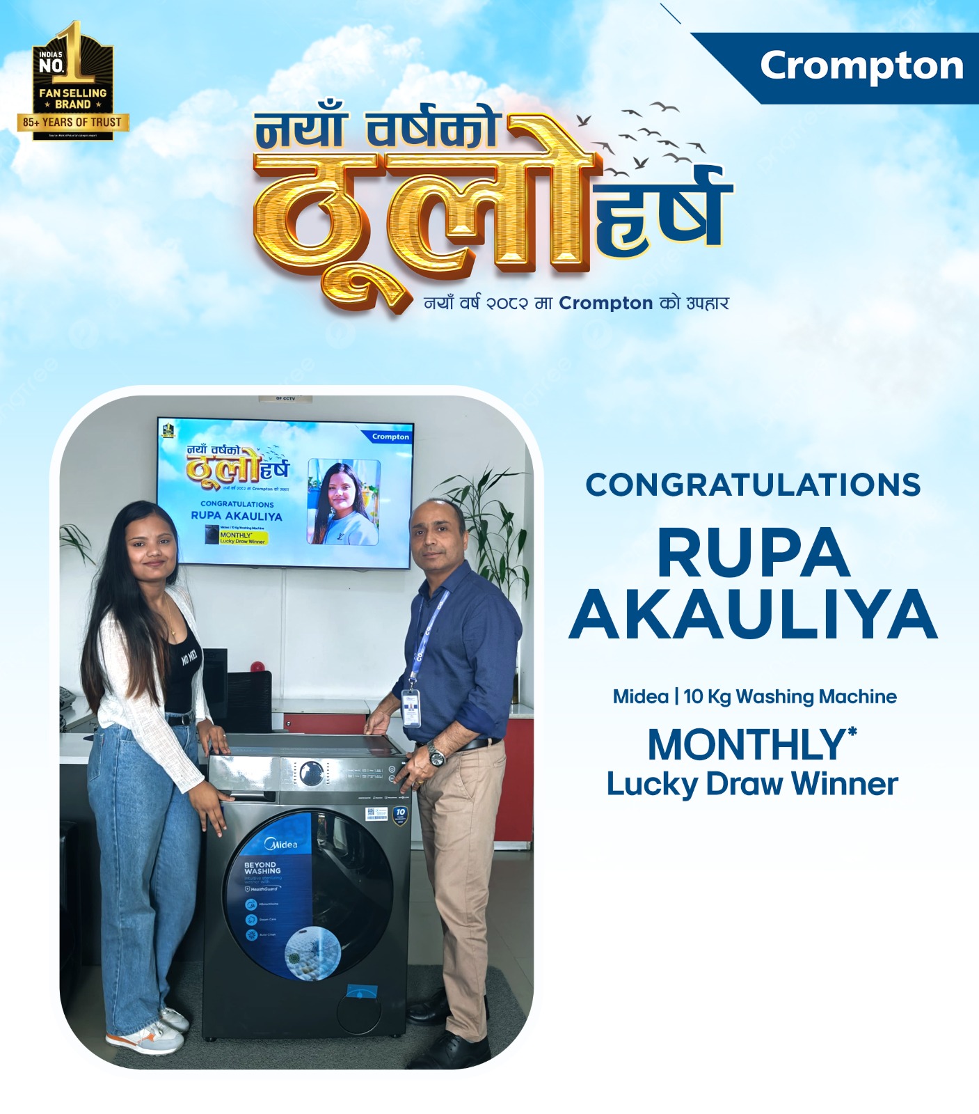 यस महिनाको लक्की ड्र बाट रूपा अकोलिया विजेता घोषित हुनुभएकाे छ। उहाँले क्रम्प्टन ब्राण्डको उत्पादन चौधरी समूहअन्तर्गतको आधिकारिक डिलरमार्फत खरिद गरी, क्यूआर कोडस्क्यान गरेर आफ्नो विवरण दर्ता गर्नुभएकाे थियाे। त्यसपछि कम्प्युटराइज्ड र्यान्डम प्रणालीबाट गरिएको ड्रमा उहाँ मिडिया १० केजी वासिङ मेशनि जित्न सफल हुनुभएकाे हाे ।
