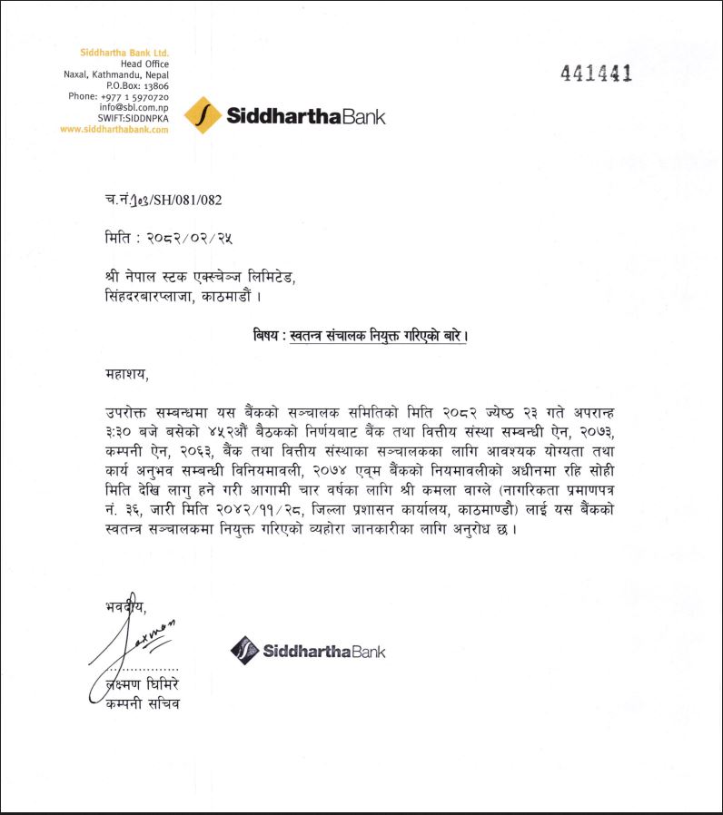 २५ जेठ, काठमाडौं । सिद्धार्थ बैंक लिमिटेडको स्वतन्त्र सञ्चालकमा कमला वाग्ले नियुक्त हुनुभएको छ । जेठ २३ गते बसेको बैंकको सञ्चालक समितिको बैठकले वाग्लेलाई चार वर्षको लागि स्वतन्त्र सञ्चालक पदमा नियुक्त गर्ने निर्णय गरेको हो ।