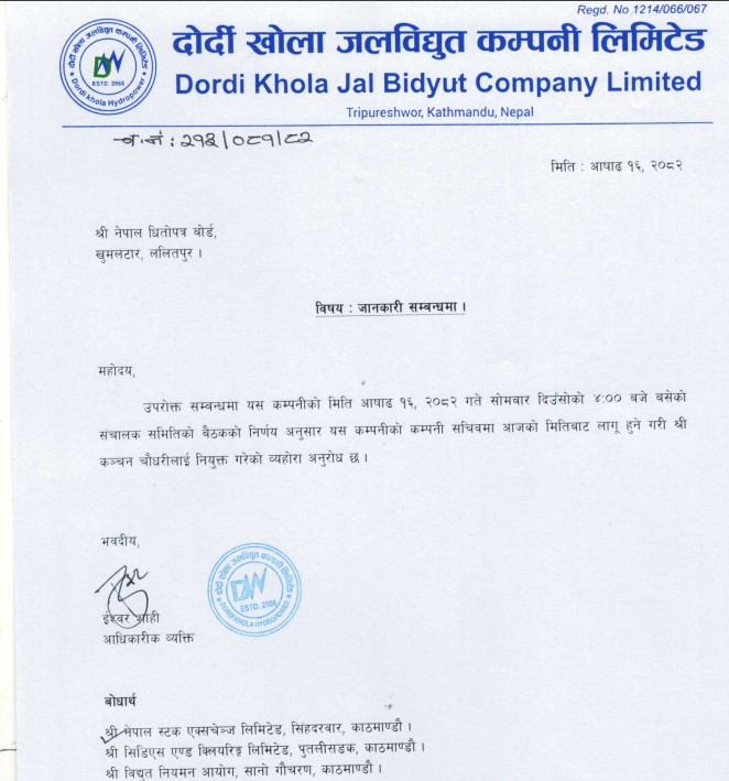 १७ असार, काठमाडौं । दोर्दी खोला जलविद्युत कम्पनी लिमिटेडको कम्पनी सचिवमा कञ्चन चौधरी नियुक्त हुनुभएको छ । असार १६ गते बसेको कम्पनीको सञ्चालक समितिको बैठकले चौधरीलाई कम्पनी सचिव नियुक्त गर्ने निर्णय गरेको हो ।