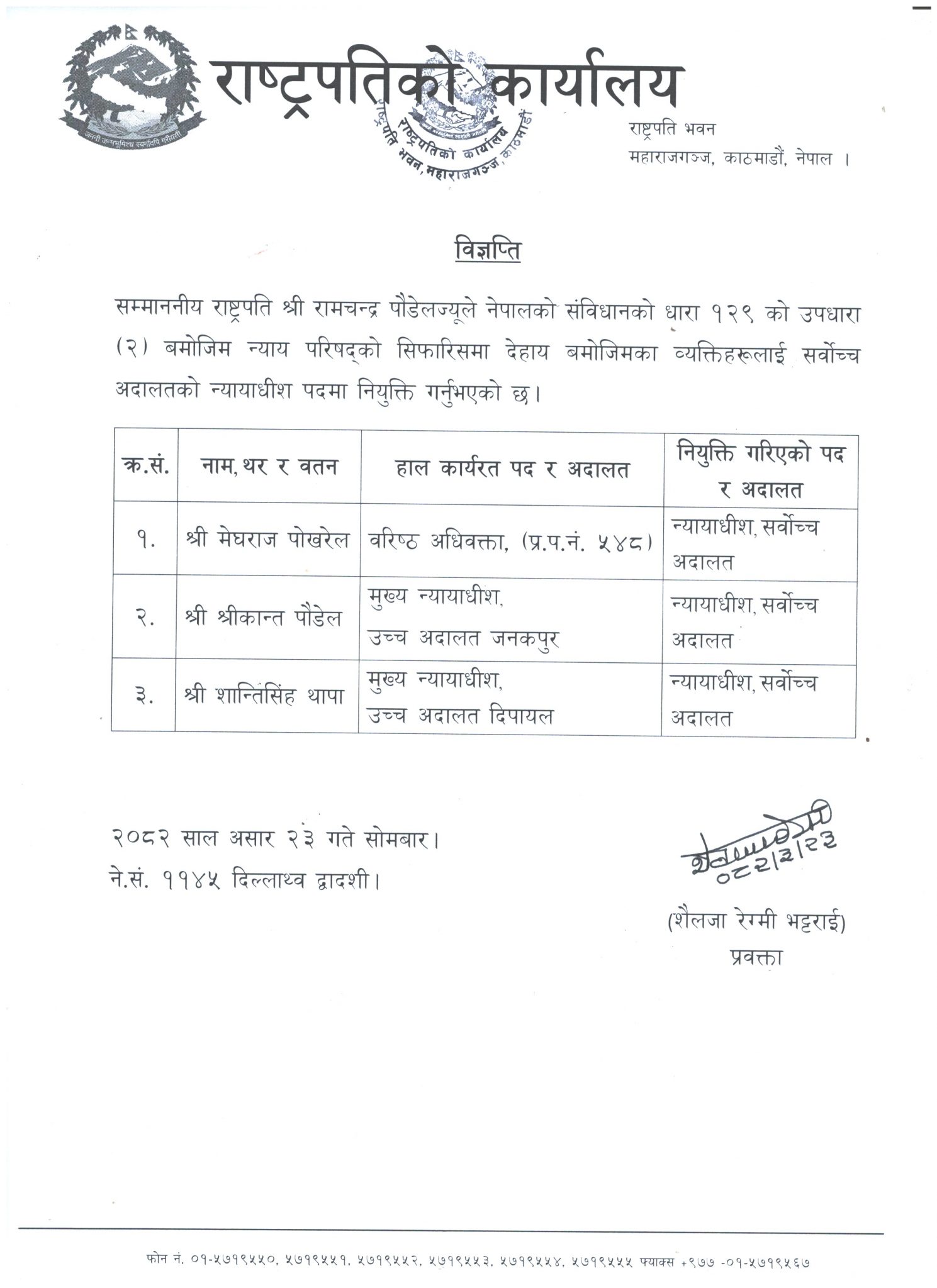 न्यायाधीश नियुक्त हुनेहरूमा मेघराज पोखरेल, श्रीकान्त पौडेल र शान्तिसिंह थापा रहनुभएको छ ।
