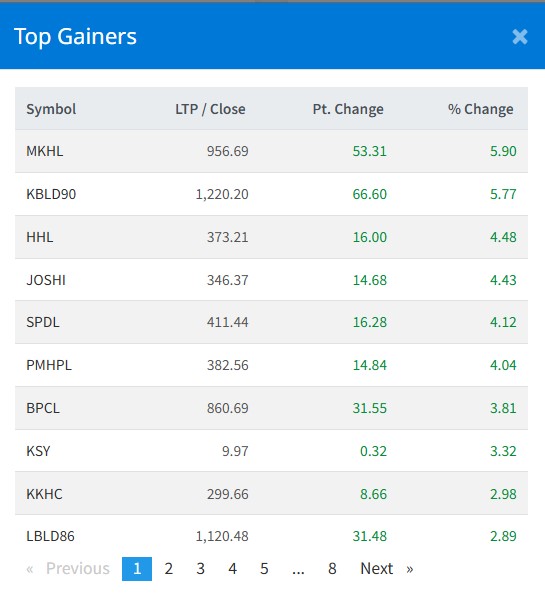 यस दिन माइखोला हाइड्रोपावरको सेयरमूल्य सर्वाधिक बढेकाे छ । यस दिन कम्पनीकाे सेयरमूल्य ५.९० प्रतिशतले बढेकाे हाे । त्यस्तै, यस दिन हिमालयन हाइड्रोपावरको सेयरमूल्य ४.४८ प्रतिशत, जोशी हाइड्रोपावरको सेयरमूल्य ४.४३ प्रतिशत, सिनर्जी पावरको सेयरमूल्य ४.१२ प्रतिशत, पञ्चकन्या माई हाइड्रोपावरको सेयरमूल्य४.०४ प्रतिशतले बढेको छ ।