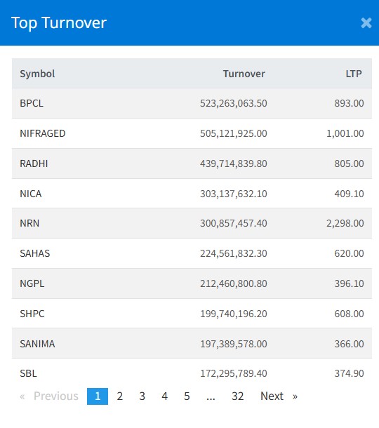 मंगलबार बुटवल पावर कम्पनीको सर्वाधिक कारोबार भएको छ । यस दिन कम्पनीको५२ करोड ३२ लाख रुपैयाँ बराबरको कारोबार भएको हो । त्यस्तै, यस दिन राधि विद्युत कम्पनीको ४३ करोड ९७ लाख रुपैयाँ, एनआइसी एशिया बैंकको ३० करोड ३१ लाख रुपैयाँ, एनआरएन इन्फ्रास्टक्चरको ३० करोड रुपैयाँको सेयर कारोबार भएको छ ।