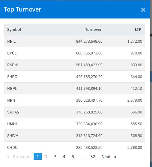 यस दिन नोपल रिइन्स्योरेन्स कम्पनीको सेयर सर्वाधिक कारोबार भएको छ । आज कम्पनीको ८४ करोड ४२ लाख ७३ हजार रुपैयाँ बराबरको कारोबार भएको छ । त्यस्तै, बुटवल पावर कम्पनीको ६० करोड ६८ लाख ६६ हजार रुपैयाँ, राधी विद्युत कम्पनीको ५६ करोड ७४ लाख ८९ हजार रुपैयाँ, सानिमा माई हाइड्रोपावरको ४२ करोड ६१ लाख ८५ हजार रुपैयाँ र ङादी ग्रुप पावरको ४१ करोड १७ लाख ९८ हजार रुपैयाँको कारोबार भएको हो ।