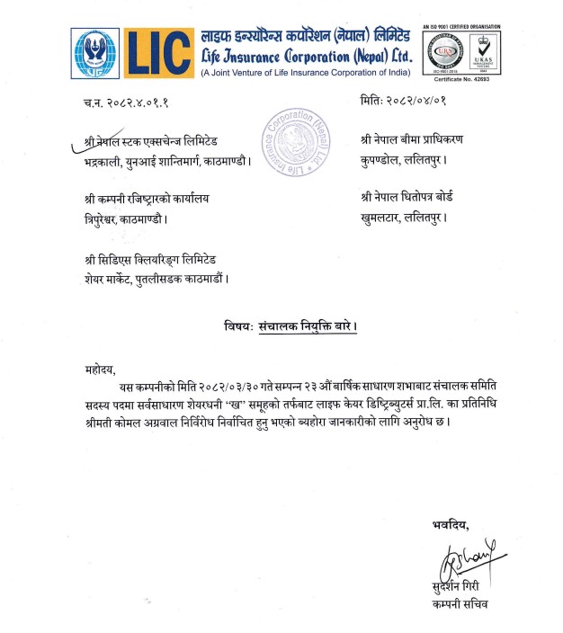 एलआइसी नेपालको सञ्चालकमा कोमल अग्रवाल निर्विरोध निर्वाचित
