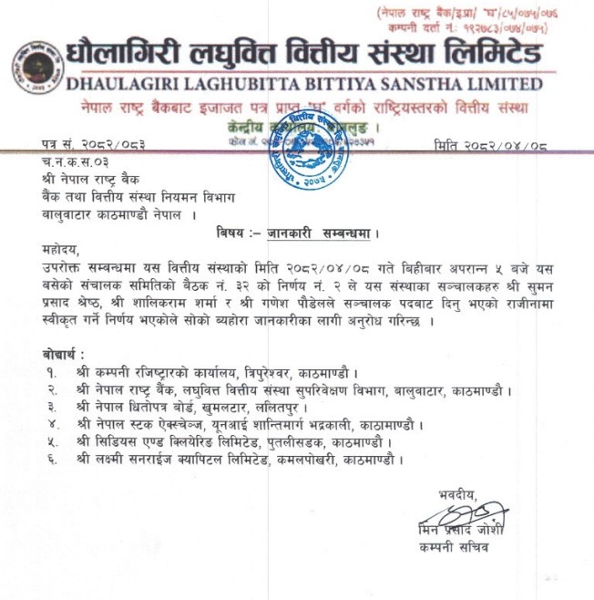 धौलागिरी लघुवित्तका ३ जना सञ्चालकले एकैपटक दिए राजीनामा