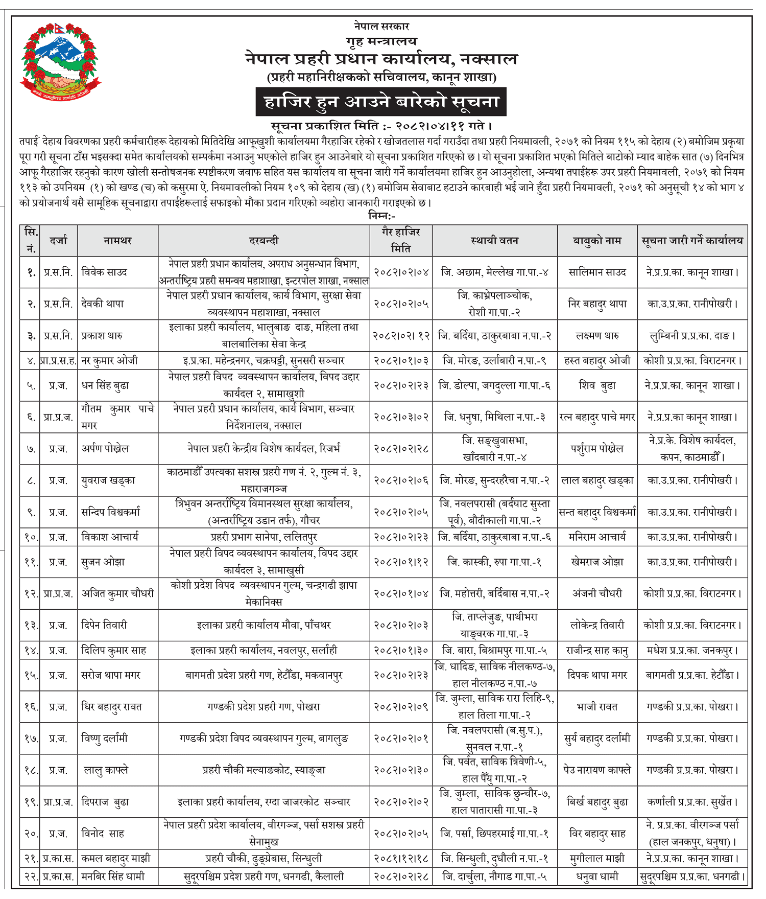 उनीहरूको खोजतलास गर्दा र प्रहरी नियमावली, २०७१ को नियम ११५ बमोजिमको प्रक्रिया पूरा गरी सूचना टाँस गर्दा पनि कार्यालयको सम्पर्कमा नआएकोले सात दिनभित्र आफू गैरहाजिर रहनुको कारण खोली सन्तोषजनक स्पष्टीकरण जवाफ सहित यस कार्यालय वा सूचना जारी गर्ने कार्यालयमा हाजिर हुन सूचनामार्फत निर्देशन दिइएको हो ।