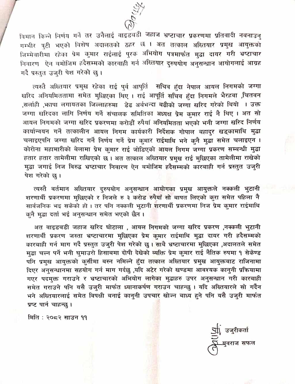 ११ साउन, काठमाडौं । अख्तियार दुरुपयोग अनुसन्धान आयोगका प्रमुख प्रेमकुमार राईविरुद्ध अख्तियारमै उजुरी परेको छ । युवराज पौडेल (सफल) ले आज राईविरुद्ध उजुरी दर्ता गर्नुभएको हो ।