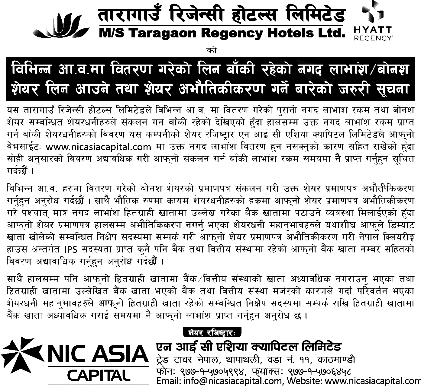 १२ साउन, काठमाडौं। तारागाउँ रिजेन्सी होटल्स लिमिटेडले विभिन्न आर्थिक वर्षमा वितरण गरेको पुरानो लाभांश लिन बाँकी सेयरधनीलाई बुझिलिन आग्रह गरेको छ।