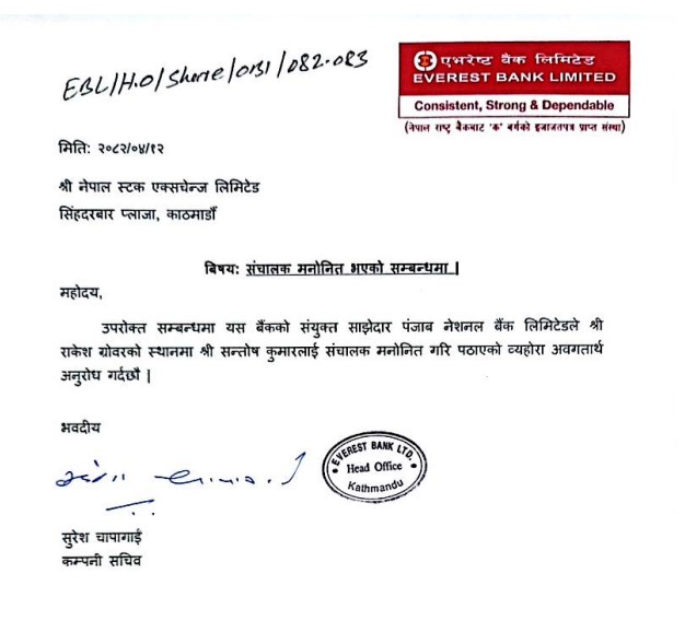 १३ साउन, काठमाडौं । एभरेष्ट बैंक लिमिटेडको सञ्चालकमा सन्तोष कुमार नियुक्त हुनुभएको छ । बैंकको सयुक्त साझेदार पंजाब नेशनल बैंकको प्रतिनिधित्व गर्दै कुमारलाई नयाँ सञ्चालकको रुपमा नियुक्त गरिएको बैंकले जनाएको छ ।