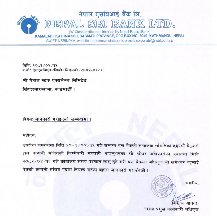 १६ साउन, काठमाडौं । नेपाल एसबिआई बैंकको कम्पनी सचिवमा खलेश्वर भट्ट नियुक्त हुनुभएको छ । साउन १५ गते बिहीबार बसेको संचालक समितिको बैठकले भट्टलाई कम्पनीको सचिवमा नियुक्त गर्ने निर्णय गरेको हो ।