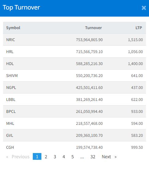 उक्त दिन नेपाल रिइन्स्योरेन्सको सेयर सर्वाधिक कारोबार भएको छ । आज कम्पनीको ७५ करोड ३९ लाख ६४ हजार रुपैयाँ बराबरको कारोबार भएको छ । त्यस्तै, यस दिन हिमालयन रिइन्स्योरेन्सको ७१ करोड ५५ लाख ६६ हजार रुपैयाँ, हिमालयन डिस्टीलरीको ५८ करोड ८२ लाख ५५ हजार रुपैयाँ, शिवम् सिमेन्ट्सको ५५ करोड २ हजार रुपैयाँ, ङादी ग्रुप पावरको ४२ करोड ५५ लाख १ हजार रुपैयाँको कारोबार भएको हो ।