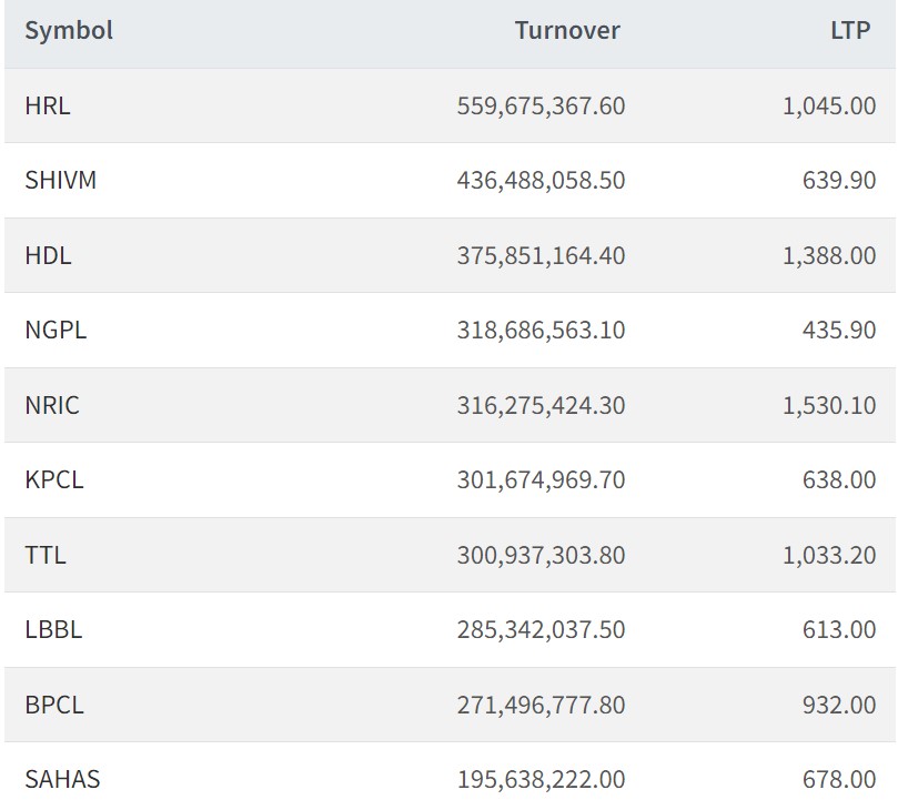 सोमबार हिमालयन रिको सबैभन्दा बढी कारोबार भएको छ । यस दिन कम्पनीको ५५ करोड ९६ लाख रुपैयाँको सेयर किनबेच भएको छ। त्यस्तै, यस दिन शिवम् सिमेन्टको ४३ करोड ६४ लाख रुपैयाँको, हिमालयन डिष्टिलरीको ३७ करोड ५८ लाख रुपैयाँको, ङादी ग्रुप पावरको ३१ करोड ८६ लाख रुपैयाँको र नेपाल रिको ३१ करोड ६२ लाख रुपैयाँको शेयर किनबेच भएको छ।