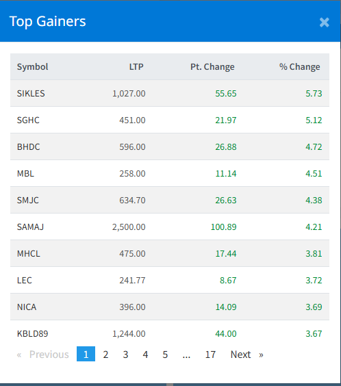 आज सिक्लेस हाइड्रोपावरले सर्वाधिक कमाएकाे छ । यस दिन कम्पनीकाे सेयरमूल्य ५.७३ प्रतिशतले बढेको छ । साथै, स्वेत गंगा हाइड्रोपावरको सेयमूल्य ५.१२ प्रतिशत, बिध्यावासनी हाइड्रोपावरको सेयमूल्य ४.७२ प्रतिशत र माछापुच्छ्रे बैंकको सेयमूल्य ४.५१ प्रतिशतले बढेको छ ।
