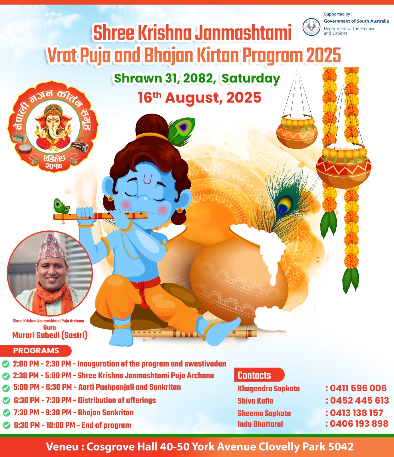 एडिलेड । नेपाली भजन कीर्तन समुह एडिलेडको आयोजनामा अगष्ट १६ शनिवार कृष्ण जन्माष्टमीको उपलक्ष्यमा भजन कीर्तन सहितको पुजा आराधना कार्यक्रम हुने भएको छ ।