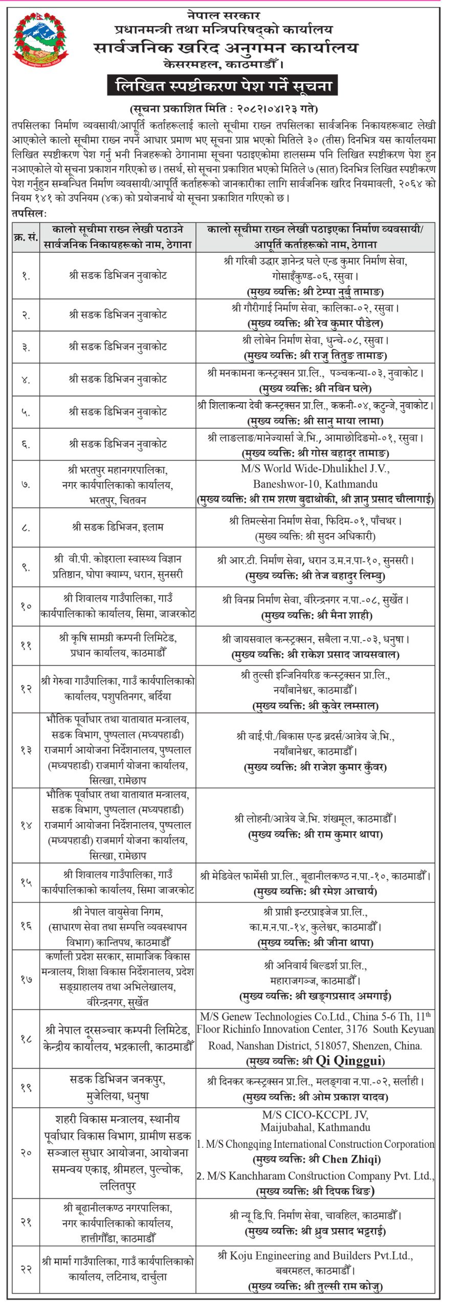 विभिन्न सरकारी निकायहरूले कालोसूचीमा राख्न भनेर सिफारिस गरेकाले सात दिने स्पष्टीकरण मागिएको सार्वजनिक खरिद अनुगमन कार्यालयले जनाएकाे छ । कार्यालयले सार्वजनिक खरिद ऐन, २०६४ को नियम १४१ को उपनियम (४क) अनुसार स्पष्टीकरण सोधेको हो । तोकिएको म्यादभित्र चित्तबुझ्दो जवाफ पेश नगरेमा प्रचलित कानुनअनुसार कालोसूचीमा राखिने सूचनामा उल्लेख छ ।